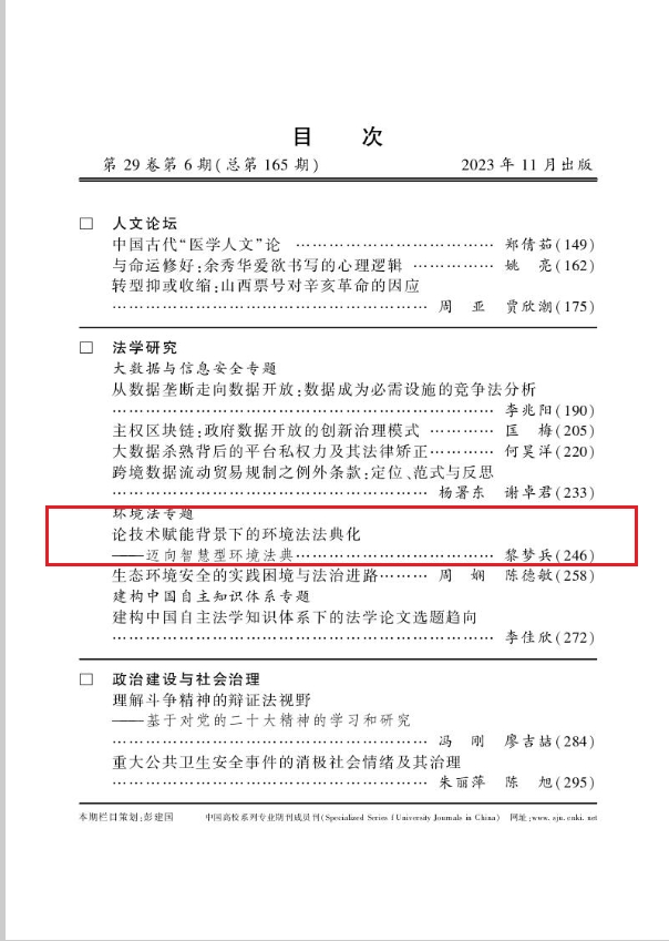 近日,问鼎在线法学院讲师黎梦兵老师在《重庆大学学报(社会科学版)》(CSSCI来源期刊)2023年第6期发表论文《论技术赋能背景下的环境法法典化——迈向智慧型环境法典》。
