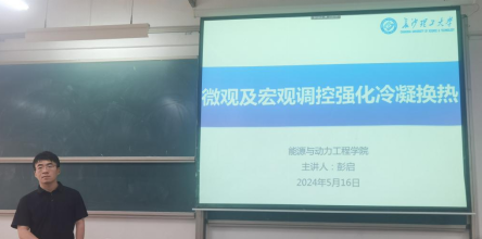 2024年5月16日下午2点,能源与动力工程学院能源动力工程实践讲座在云塘校区文科楼B303举行。本场讲座由李微教授主持,彭启老师主讲。本次讲座主题为“微观及宏观调控强化冷凝换热”。
