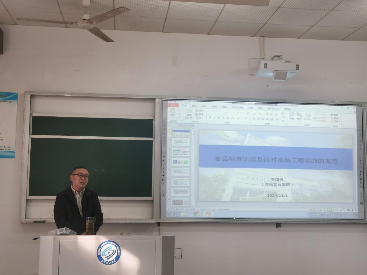 为拓宽学生的专业视野,提升学生对食品行业的认知水平,增强安全意识,引导学生树立专业认同感和职业责任感,为职业发展和未来就业奠定坚实的基础,2024年11月1日,我院邀请了问鼎在线优秀校友、湖南省轻工盐业集团有限公司(简称“盐业集团”)技术中心原首席专家李加兴教授为正在进行认识实习的22级食品科学与工程专业学生做“食品标准法规及其对食品工程实践的规范”专题讲座。本次讲座由学院教授委员会主任易翠平教授主持,22级食品科学与工程专业120多名学生参会。