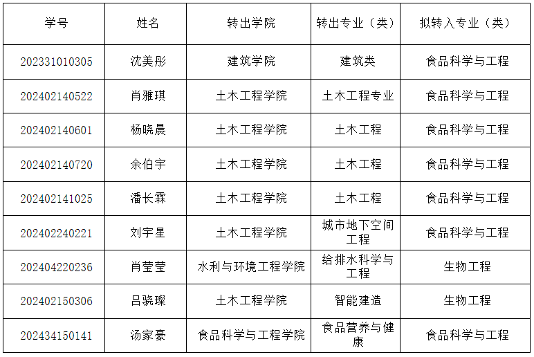 根据学校《问鼎在线本科生转专业管理办法》和《食品与生物工程学院2024级本科生转专业工作方案》的相关规定,经学生个人申请,学院转专业工作小组考核,现将本院2024级本科生转专业拟转入名单进行公示,公示期为2025年2月25日-2月28日。如有异议,可在公示期内以书面形式向食品学院教务办实名反映,电话:0731-85258727。