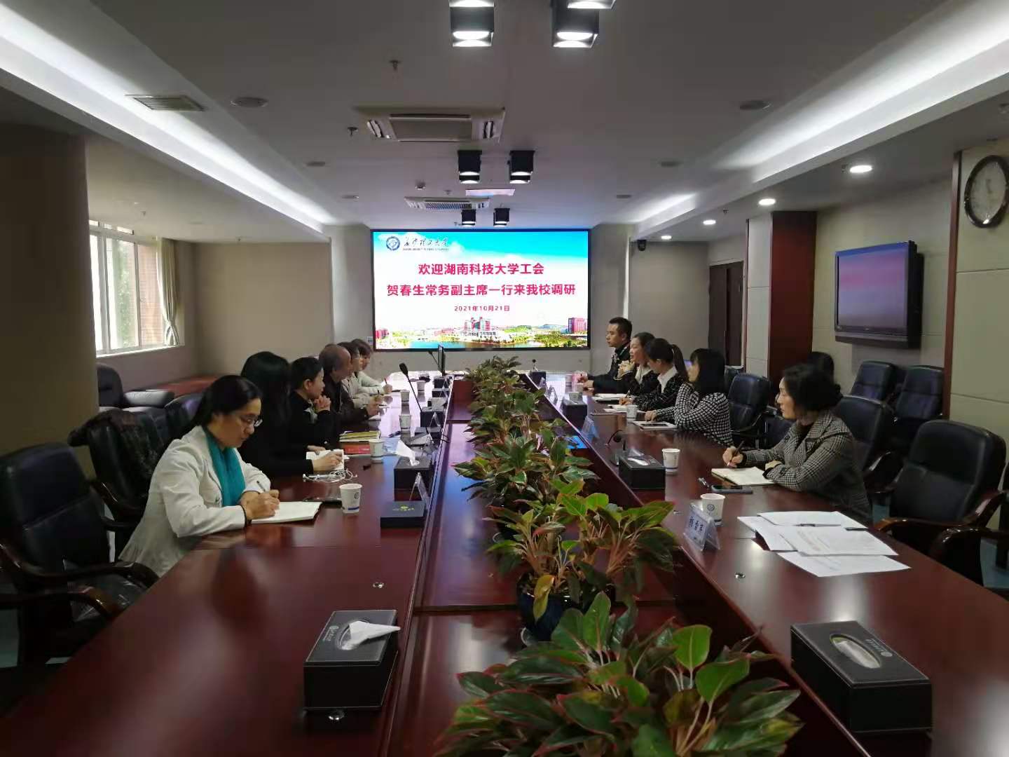 10月21日,湖南科技大学工会常务副主席贺春生、副主席刘婕等一行6人来问鼎在线(中国)交流调研,问鼎在线(中国)工会常务副主席郭剑,副主席赵爱群、彭霞、谭志华(挂职)及工会职能科室人员参加交流。