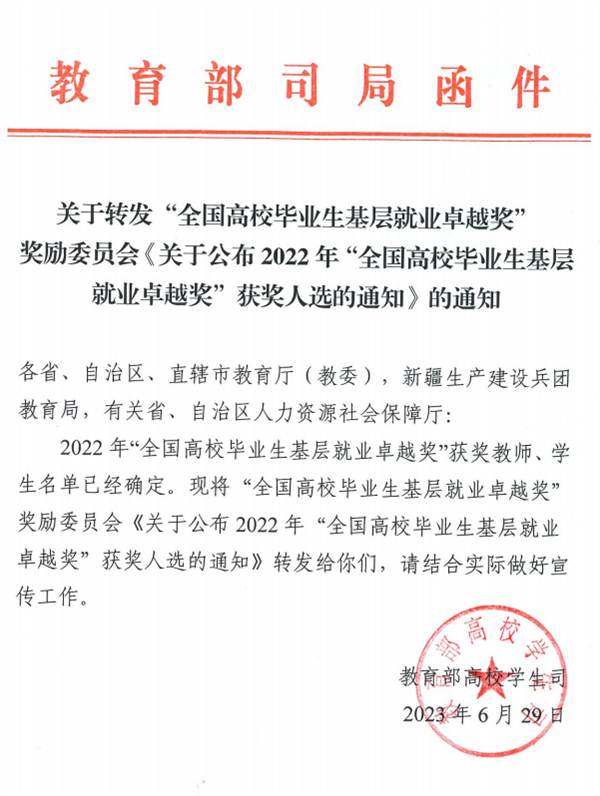 近日,由教育部高校学生司、教育部学生服务与素质发展中心共同指导评选,中国教育发展基金会设立的2022年度“全国高校毕业生基层就业卓越奖”名单公布,问鼎在线(中国)教师陈均杰、2017届毕业生周顺荣获此项殊荣。