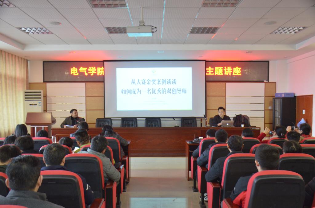 为提升双创人才培养质量及工作水平,118日上午,电气学院特邀北京大学光华管理学院MBA、中国人民大学 MBA、深圳前海梧桐并购基金董事总经理蒋楠作了题为《从大赛金奖案例谈如何成为一名优秀的双创导师》的主题讲座。电气学院党委书记符慧林、副书记丁丹,设计艺术学院党委副书记陶双、学业指导团队及电气、艺术、经管等学院80余名老师参加。