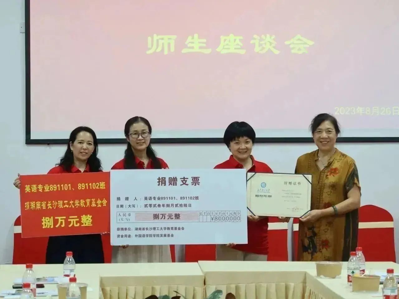 座谈会上,洪文翰老师重温过往,畅叙师生情,全体校友们面带笑颜,倾耳聆听,仿佛三十年前那群专心听讲、目光澄澈的少年。为表达感恩之情,89级英语专业校友代表们为曾经的恩师送上了精心准备的礼物以感谢老师的谆谆教诲,并捐赠8万元学院发展基金为感谢母校的辛勤栽培。
