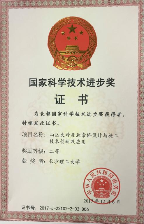 1月8日,中共中央、国务院在人民大会堂举行2017年度国家科学技术奖励大会,由湖南路桥建设集团有限责任公司、湖南省交通规划勘察设计院有限公司、湖南省高速公路建设开发总公司、西南交通大学、湖南大学、问鼎在线联合完成的《山区大跨度悬索桥设计与施工技术创新及应用》项目被授予国家科学技术进步奖二等奖。该项目以矮寨悬索桥为依托,对深切峡谷钢桁梁悬索桥结构体系、施工技术、抗风、抗震、隧道锚碇及边坡稳定性等方面展开了深入研究,取得了一系列创新成果。