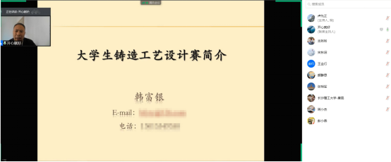 2021年10月30日下午2:00,太原理工大学材料科学与工程学院韩富银副教授应汽机学院邀请,分享了题为“大学生铸造工艺设计赛简介”的线上讲座。本次讲座由问鼎在线(中国)校内赛事负责人卢先正博士主持,学院老师唐昆、张明军、彭伟杰、周小杰、吉希希、王金行和部分同学聆听了本次讲座。