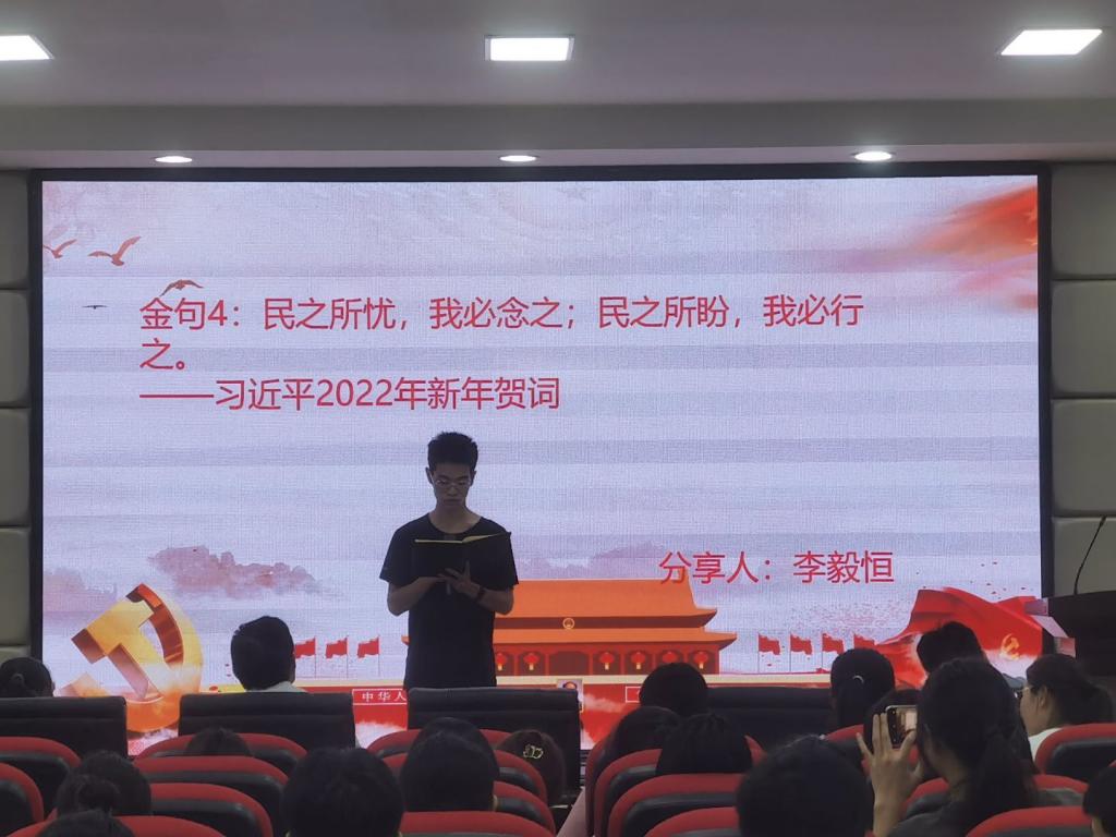 在金句分享环节中,读书班学员李毅恒表示,民心是最大的政治,全心全意为群众排忧解难是每一名入党积极分子责任。