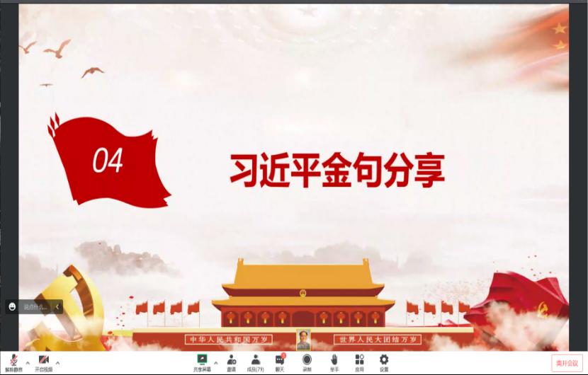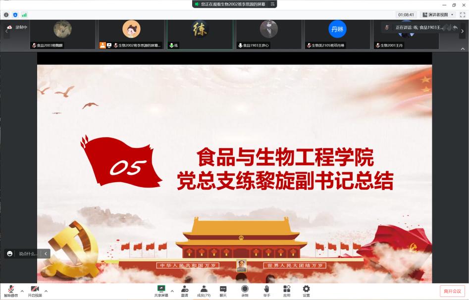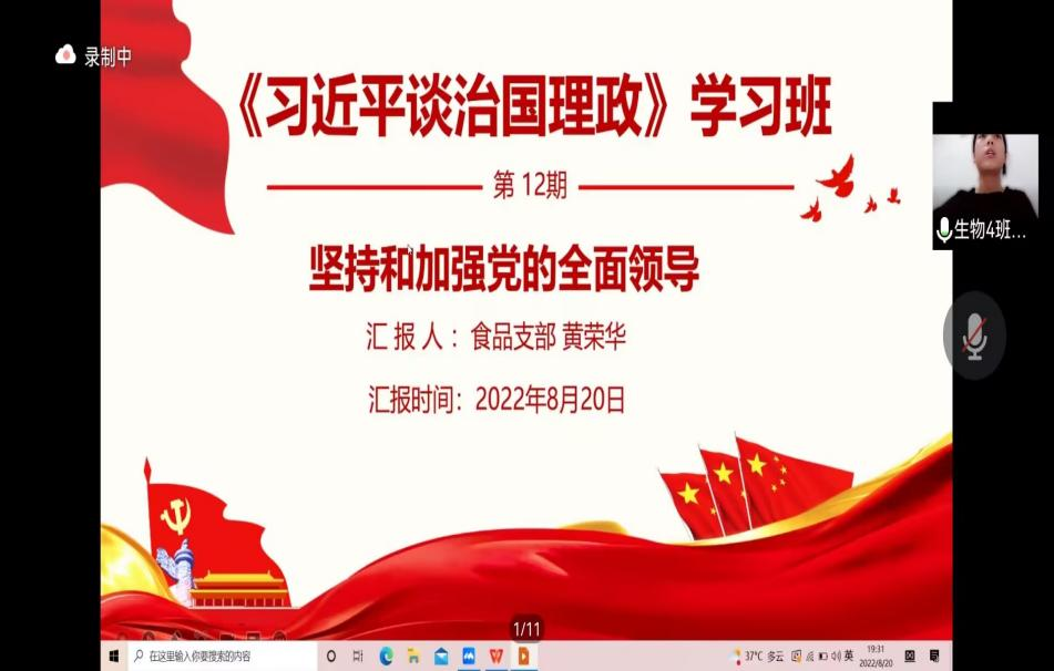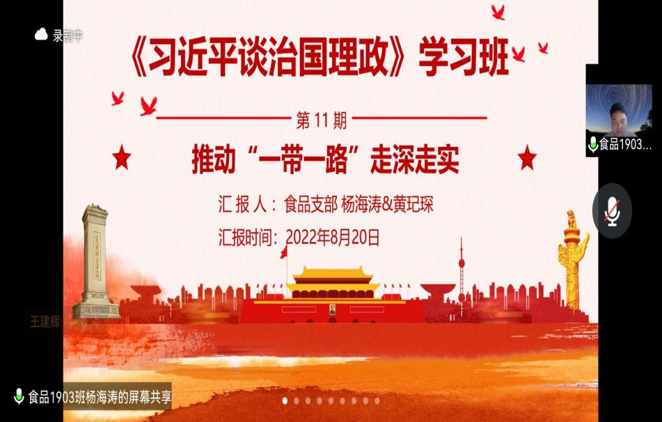 2022年8月20日,问鼎在线食品与生物工程学院食品本科生党支部在腾讯会议举办《习近平谈治国理政》读书班第六次读书分享会。食品学院党总支书记王建辉、党总支副书记练黎旋、学工办老师胡佳佳等师生近100余人参加此次活动。