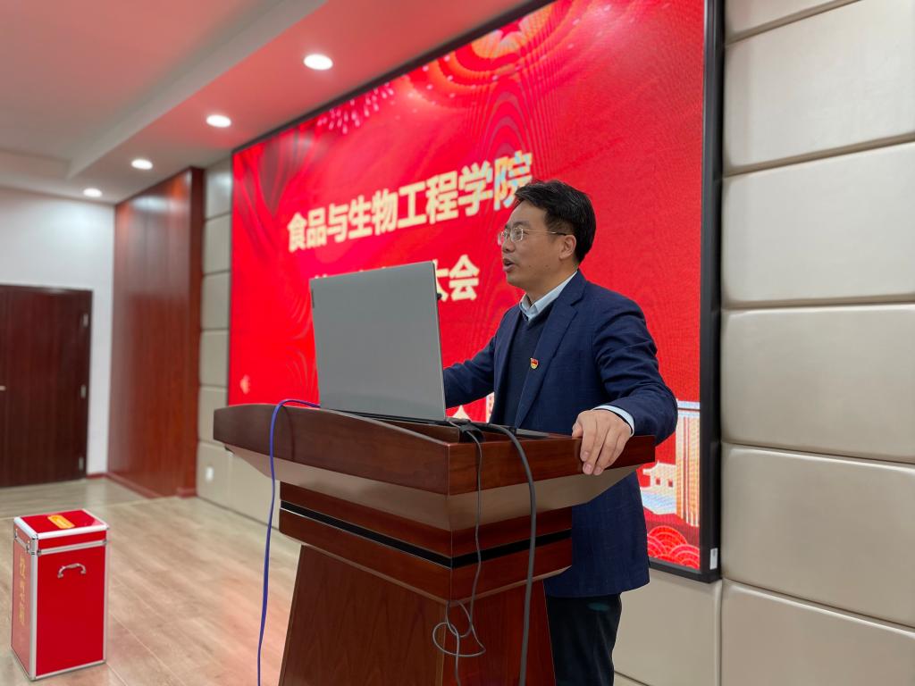 王建辉代表学院党总支作《凝心聚力,以博士点获批建设为新起点,开启新学院高质量发展新征程》工作报告。报告总结了学院过去的主要工作和成就,展望了学院未来的发展目标和思路。报告充分认识到我院面临的机遇挑战,并从学科与学位点建设、专业建设与本科人才培养、师资队伍建设、科研与社会服务、学生工作与对外交流等六大方面规划了学院的发展目标和思路。学院将在实现食品科学与工程一级学科博士点和国家级一流建设专业突破的基础上,瞄准食品、生物行业需求,立足湖南,服务全国,到2035年,将学院打造成为食品、生物行业的“人才培养中心”、“技术创新中心”、“成果转化中心”和“决策咨询中心”,建设成为高素质人才培养、高水平科技创新、服务国家“健康中国”与湖南“三高四新”战略的国内一流应用研究型学院。报告强调要凝心聚力,着力做好五个方面的工作:一是要坚持党建引领,促进学院高质量发展;二是要坚持立德树人,推进一流人才培养;三是要坚持引育并举,实施人才兴院战略;四是要坚持交叉融合,推进一流学科建设;五是要坚持聚焦前沿,实施科技强院战略。