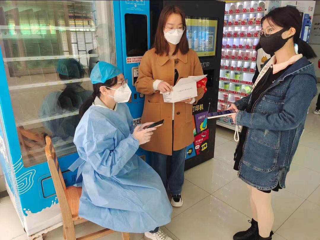 图3 盛灿梅老师在学生宿舍参加核酸检测志愿者工作