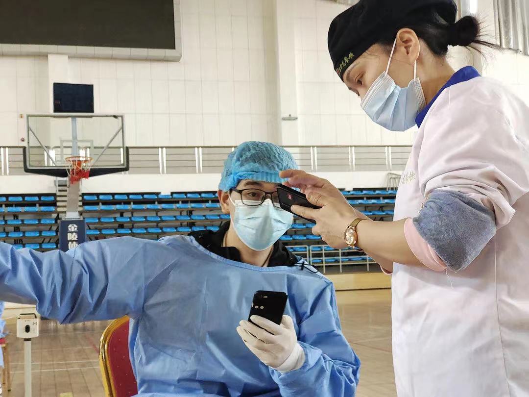 图6 张博老师在体育馆参加核酸检测志愿者工作