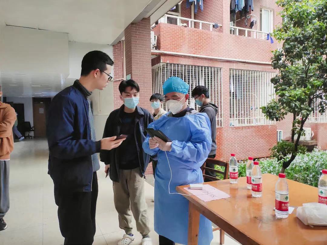 图1 李巍青老师在学生宿舍参加核酸检测志愿者工作