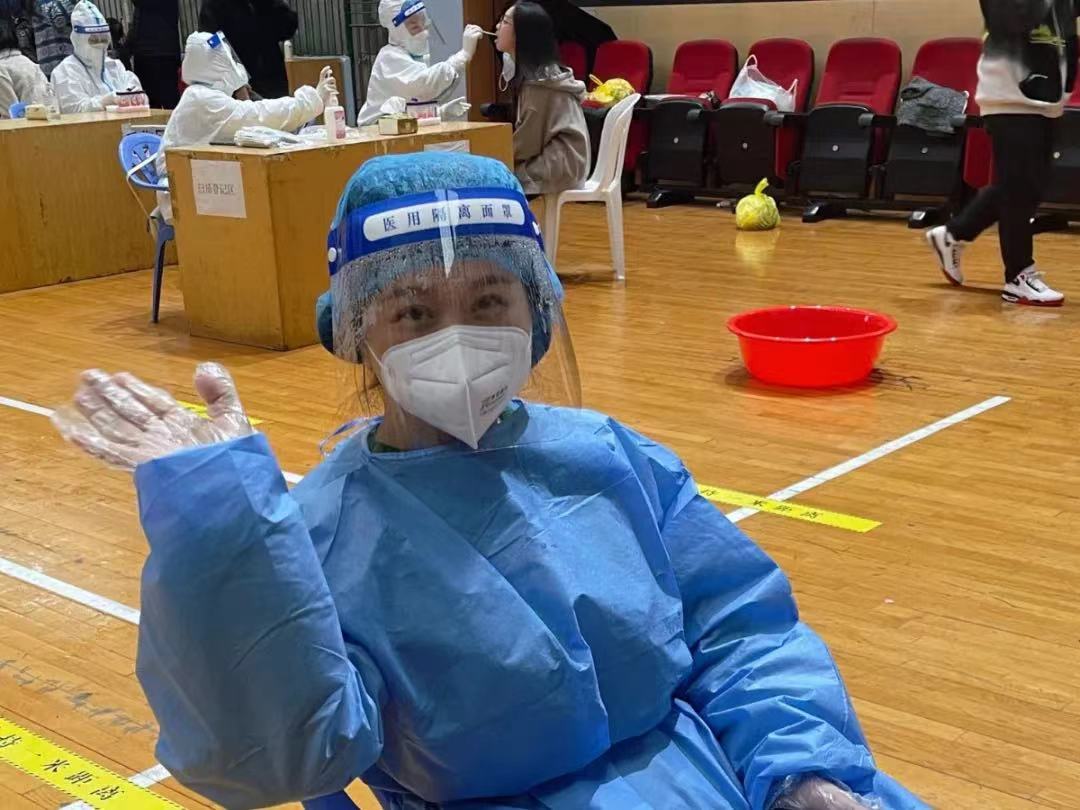 图9 袁洁瑶老师在体育馆参加核酸检测志愿者工作