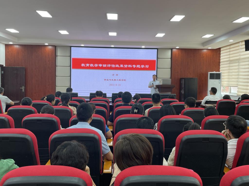 9月19日下午,食品与生物工程学院在工科三号楼A320开展了教育教学审核评估政策资料专题学习和基于OBE的课程目标的制定、落实与考核评价专题讲座,学院党政领导班子和全体教职工参加会议。